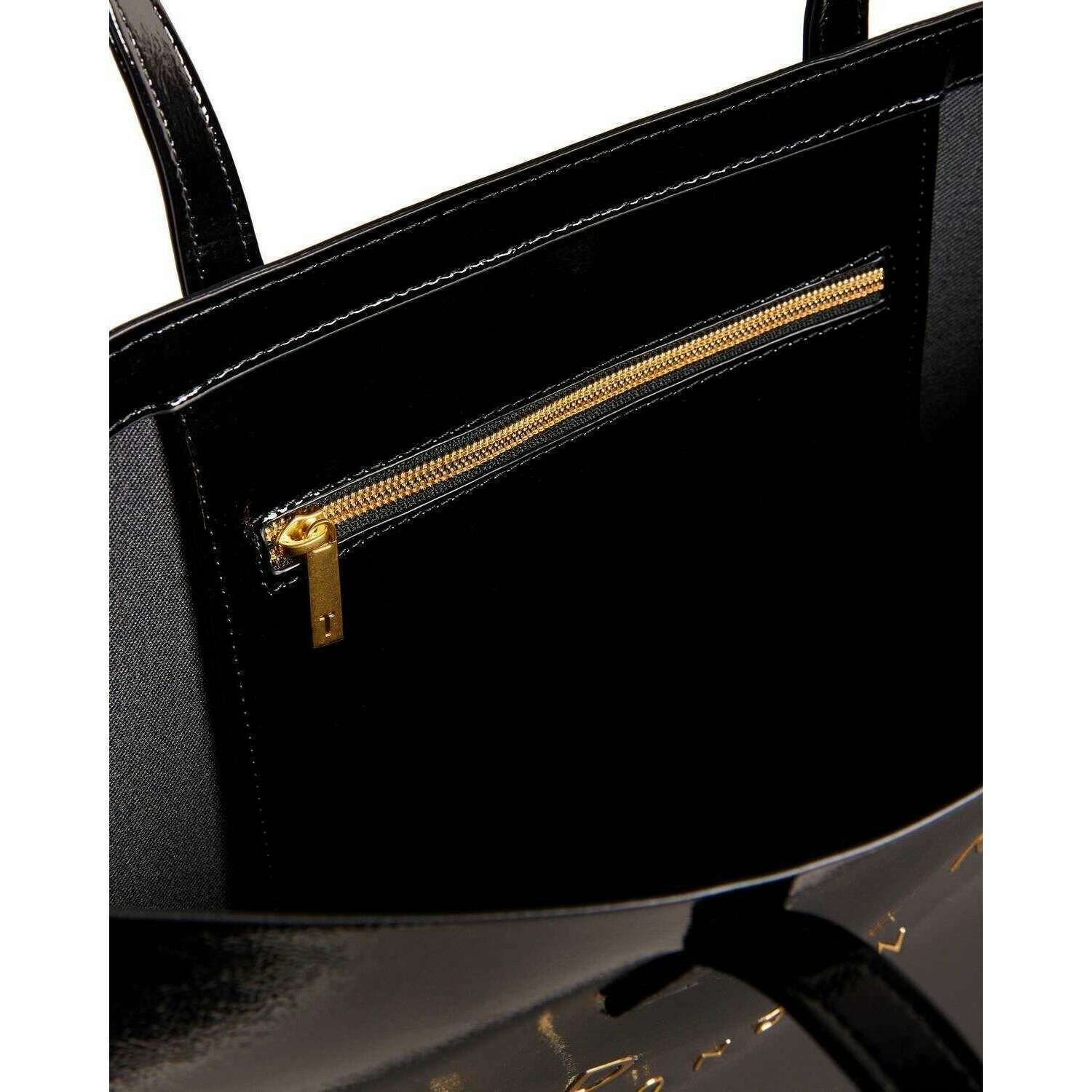• Patent Faux Leather , Crinkle Texture , Shoulder Straps , Gold Large Logo Fetail on Front , Internal Zipper Pocket